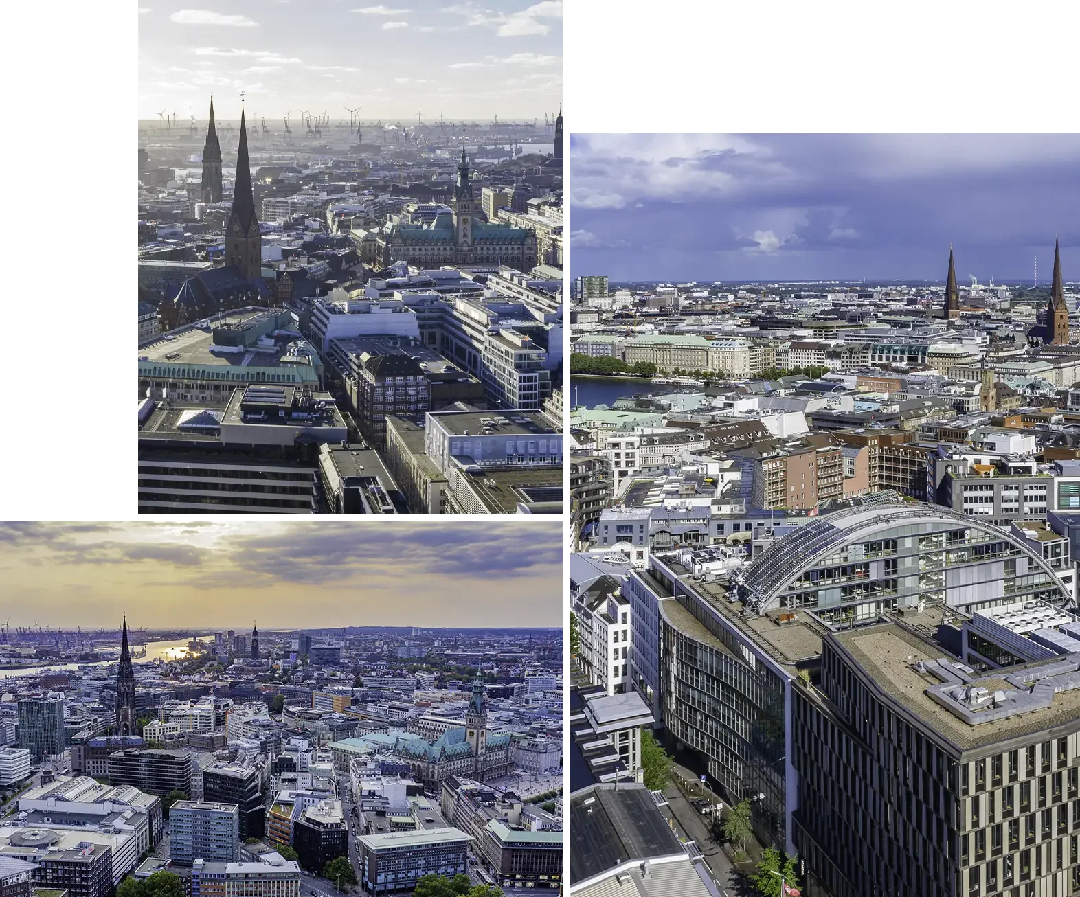 Ob die Elbphilharmonie, die Speicherstadt, die Landungsbrücken oder der Hamburger Hafen – jede Perspektive zeigt Hamburgs Vielfalt und Dynamik auf eindrucksvolle Weise. Auch aus der Luft wirkt das Zusammenspiel von Wasser, Stadt und Industrie besonders reizvoll.